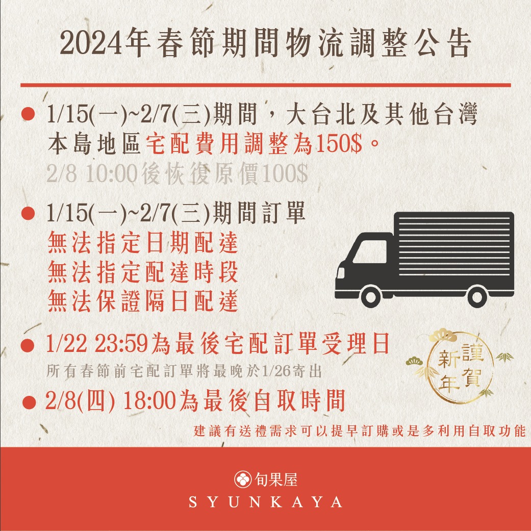 3.因週休二日關係,訂單受理作業將於平日星期一10:00~星期五15:00受理(若遇國定假日則延後受理)。