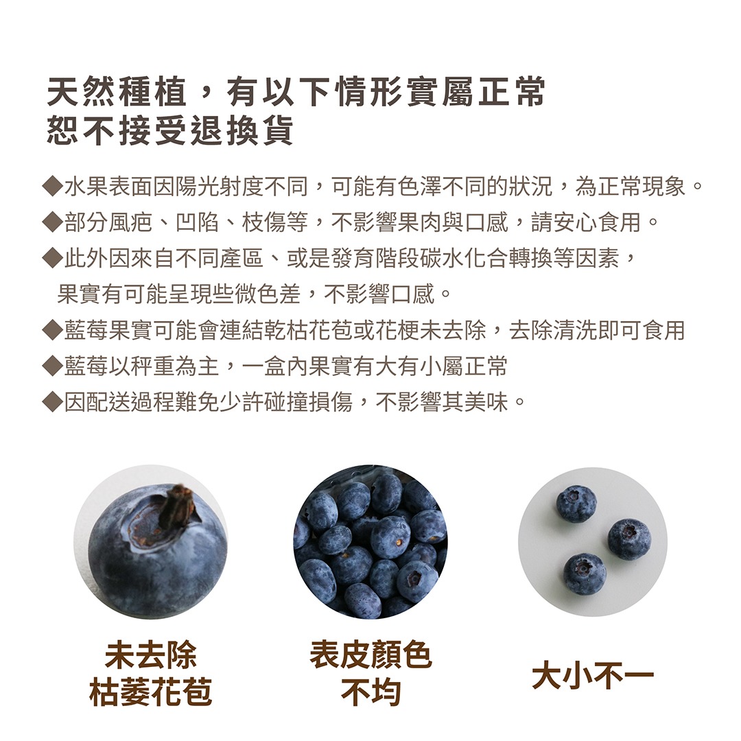 另外因宅配及原裝運輸關係,會有輕微損傷(5-10%的果損),但不影響食用,“完美主義者請三思考慮”。